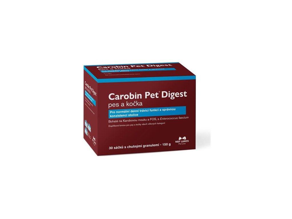 NBF Lanes Carobin Pet Digest je přírodní doplňkové krmivo ve formě prášku určené pro psy a kočky všech věkových kategorií. Obsahuje karobovou moučku, fruktoligosacharidy (FOS) a probiotikum Enterococcus faecium, které podporují správnou funkci trávicího traktu. Působí proti nadýmání, zápachu z tlamy, kručení v břiše a koprofágii. Zlepšuje konzistenci stolice a přispívá k hygieně perianální oblasti. Neobsahuje živočišné bílkoviny, a je tudíž vhodné i při dietním režimu.