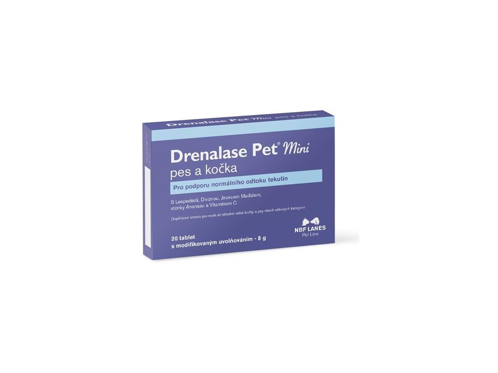 NBF Lanes Drenalase Pet Mini je přírodní doplňkové krmivo pro psy malých a středních plemen a kočky všech věkových kategorií, určené k podpoře normálního odvodu tekutin při všech typech otoků. Obsahuje lespedézii, diviznu, jírovec, ananasový stonek a vitamín C. Pomáhá při otocích spojených s chirurgickými zákroky, traumatem, zánětem nebo působením bakterií, virů, chemikálií a tepla. Klinicky účinný přípravek bez vedlejších účinků, vhodný ke kombinaci s běžnou farmakologickou léčbou, podporuje rychlou regeneraci a obnovu funkce tkání. Tablety s postupným uvolňováním jsou nedělitelné a většina zvířat je přijímá bez problémů.