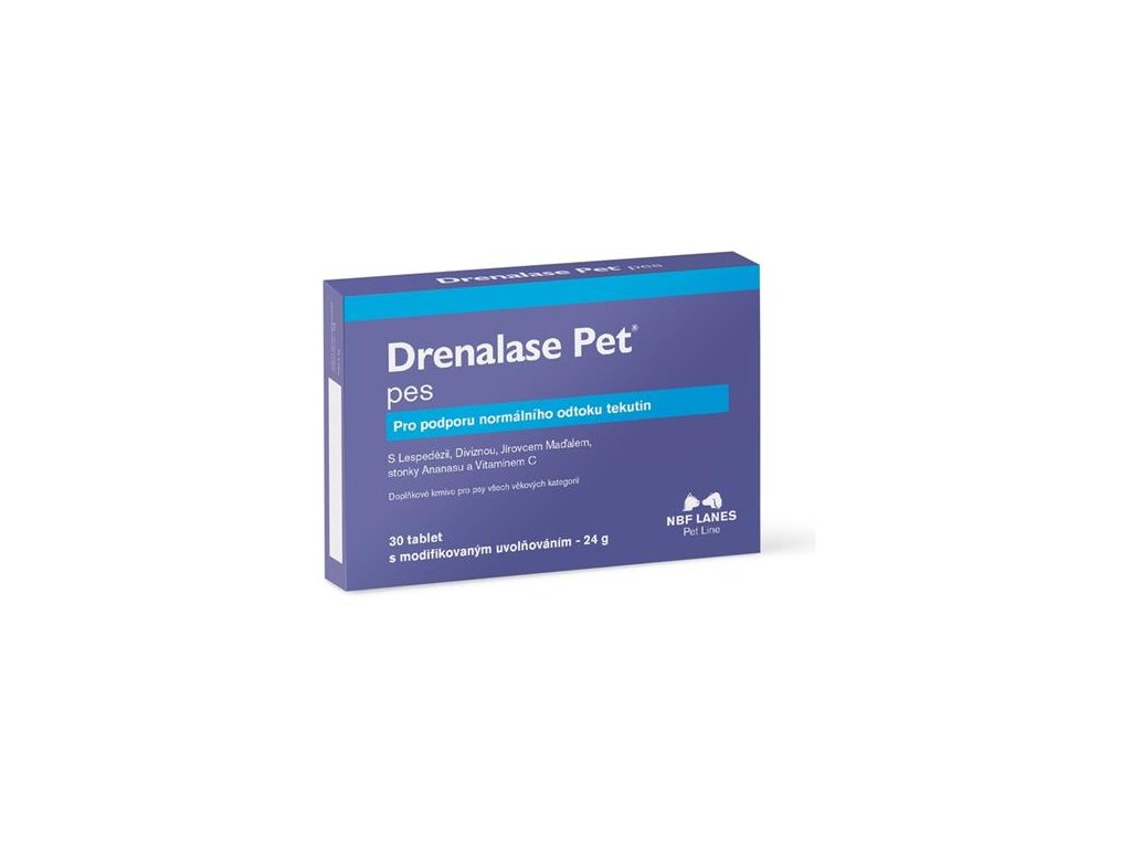 NBF Lanes Drenalase Pet je přírodní doplňkové krmivo pro psy středních a velkých plemen všech věkových kategorií určené k podpoře normálního odvodu tekutin při všech typech otoků. Obsahuje lespedézii, diviznu, jírovec, ananasový stonek a vitamín C. Pomáhá při otocích spojených s chirurgickými zákroky, traumatem, zánětem nebo působením bakterií, virů, chemikálií a tepla. Klinicky účinný přípravek bez vedlejších účinků, vhodný ke kombinaci s běžnou farmakologickou léčbou, podporuje rychlou regeneraci a obnovu funkce tkání. Tablety s postupným uvolňováním jsou nedělitelné a většina zvířat je bez problémů přijímá.
