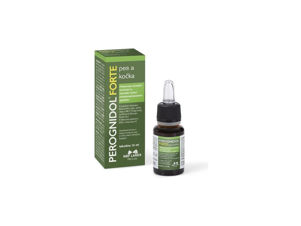 NBF Lanes Perognidol Forte je přírodní doplňkové krmivo ve formě kapek určené pro psy a kočky všech věkových kategorií. Je obzvláště vhodné pro starší zvířata trpící artrózou nebo chronickými bolestmi. Kapky obsahují certifikovaný konopný olej (bez THC, těžkých kovů, pesticidů), vysoký podíl MCT tuků a rybí olej (EPA, DHA), beta-karyofylen, vitamín E a přírodní extrakt z rozmarýnu. Podporuje přirozenou činnost endokanabinoidního systému a pomáhá normalizovat vnímání bolesti (tzv. nocicepci) u psů a koček.