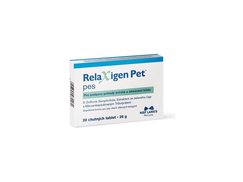 NBF Lanes Relaxigen Pet je přírodní doplňkové krmivo ve formě chutných tablet pro psy velkých plemen všech věkových kategorií. Je určeno pro případy nepřiměřené reakce na stres, například při stěhování, cestování, příchodu či odchodu zvířete nebo osoby, silných hlukových podnětech, osamělosti, hyperaktivitě, nevhodném kálení nebo močení, pica, případně při nadměrných nárocích na péči. Produkt působí na osu střevo–mozek prostřednictvím kombinace tyndalizovaných bakterií, prebiotik (FOS) a mikrokapsulované kyseliny máselné (postbiotikum). Tablety jsou snadno dělitelné, což usnadňuje podávání.