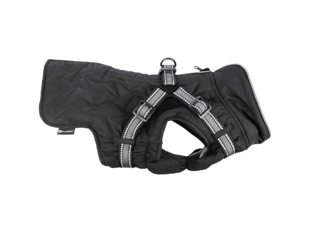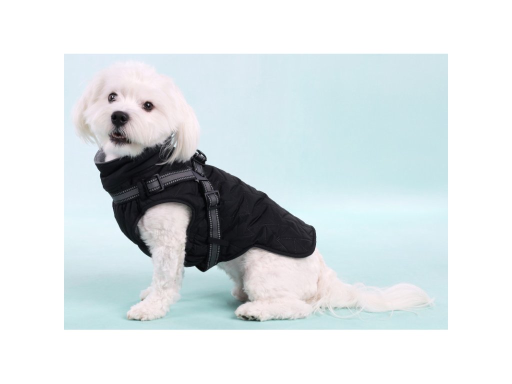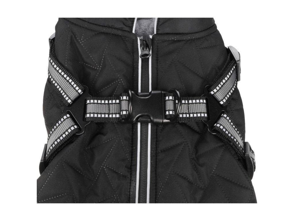 Zimní bunda Duker je ideální volbou pro psy zvyklé na postroj. Vnější nastavitelný postroj je opatřený dvěma kroužky pro připnutí vodítka a reflexními proužky pro lepší bezpečnost za snížené viditelnosti. Bunda má vrchní prošívanou vrstvu z voděodolného materiálu a příjemnou flísovou podšívku, která udrží psa v teple a pohodlí. Vesta se snadno zapíná pomocí zipu a postroj pomocí trojzubcové spony na hřbetě. Pružné krytí břicha a stojáček zamezují úniku tepla.