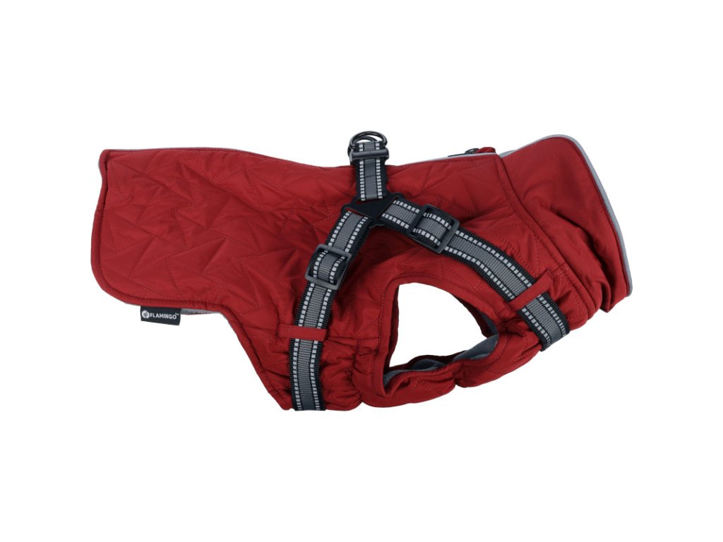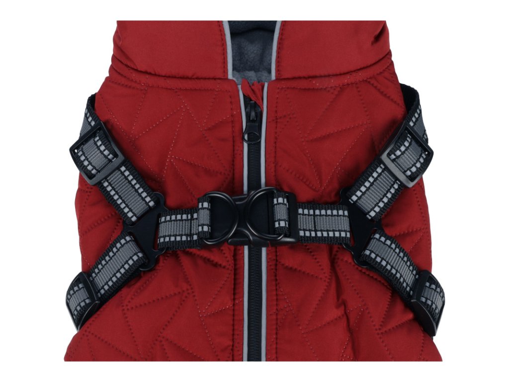 Zimní bunda Duker je ideální volbou pro psy zvyklé na postroj. Vnější nastavitelný postroj je opatřený dvěma kroužky pro připnutí vodítka a reflexními proužky pro lepší bezpečnost za snížené viditelnosti. Bunda má vrchní prošívanou vrstvu z voděodolného materiálu a příjemnou flísovou podšívku, která udrží psa v teple a pohodlí. Vesta se snadno zapíná pomocí zipu a postroj pomocí karabiny na hřbetě. Pružné krytí břicha a stojáček zamezují úniku tepla.