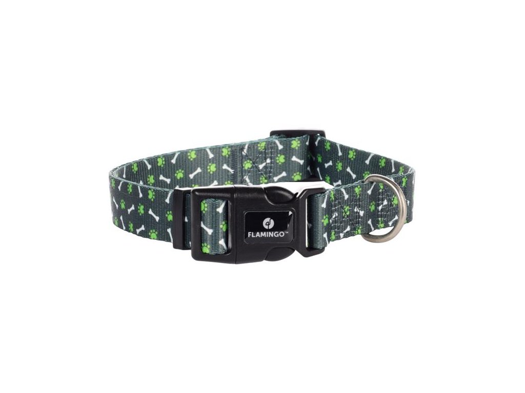 Obojek Flamingo Safia s potiskem tlapek a kostí je vhodný pro štěňata i dospělé psy. Je vyroben z pevného a voděodolného nylonu. Má pohodlné zapínání na plastovou přezku a je opatřen chromovaným D-kroužkem na připnutí vodítka. Délku lze nastavit v rozmezí 45–65 cm.