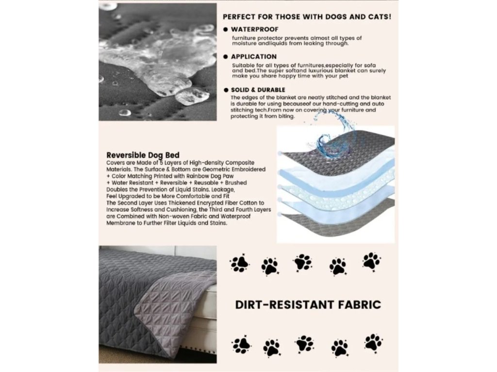 Oboustranný přehoz na pohovku ve 4 velikostech je ideálním řešením pro každou domácnost se psy a dalšími domácími mazlíčky. Chrání nábytek před chlupy, poškrábáním, politím, skvrnami i běžným opotřebením. Díky voděodolnému materiálu zůstane vaše pohovka čistá a suchá i při drobných nehodách. Přehoz je praktický, snadno se nasazuje a udržuje. Otočný design umožňuje snadnou změnu vzhledu – vybírejte ze stylové šedé nebo elegantní khaki barvy.