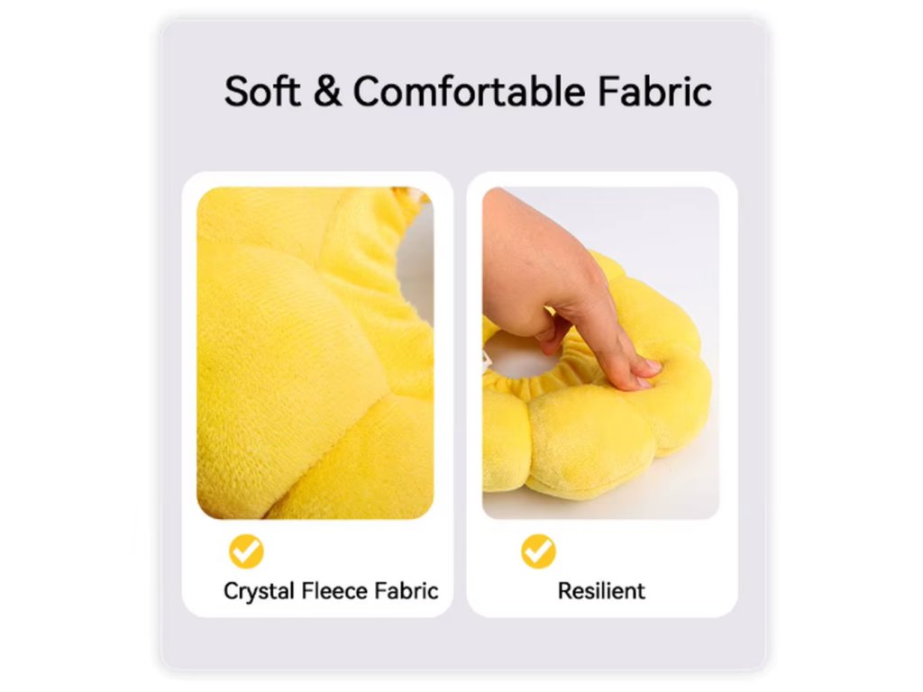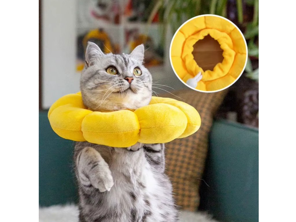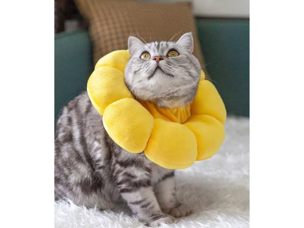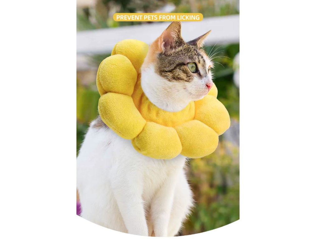 Ochranný límec "slunečnice" pro kočky je měkký ochranný límec pro kočky, který pomáhá zabránit olizování ran, škrábání zranění nebo podrážděné kůže po operacích či veterinárních zákrocích 🐱🌻. Díky roztomilému designu slunečnice a pohodlnému plyšovému materiálu je mnohem příjemnější alternativou ke klasickému plastovému límci.