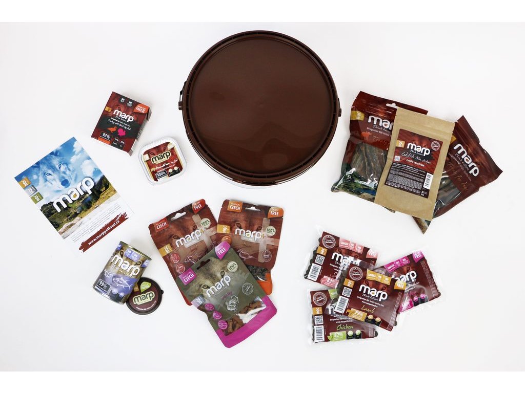 Výhodným balením, kromě nejvytříbenějších dobrot, získáte zdarma praktický kyblík např. na granule, víčko na konzervy, vzorky krmiv a propagační materiál.