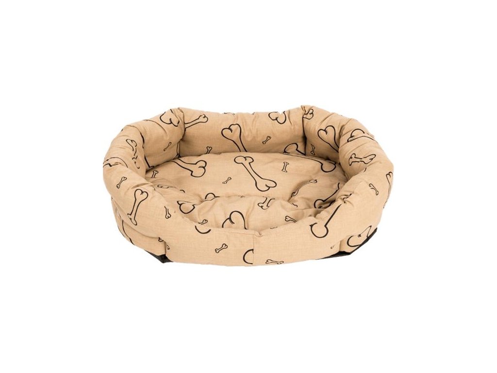 Pohodlný, kvalitní pelech vyrobený z bavlněné látky s potiskem kostí, vyplněný dutým vláknem a tuhým molitanem. Pelíšek je v několika bodech prošitý, aby nedošlo k nerovnoměrnému rozmístění výplně. Polštářek je vyjímatelný. Boky pelíšku jsou kvůli dobré opoře bohatě vyplněny. Pelech se lehce udržuje.