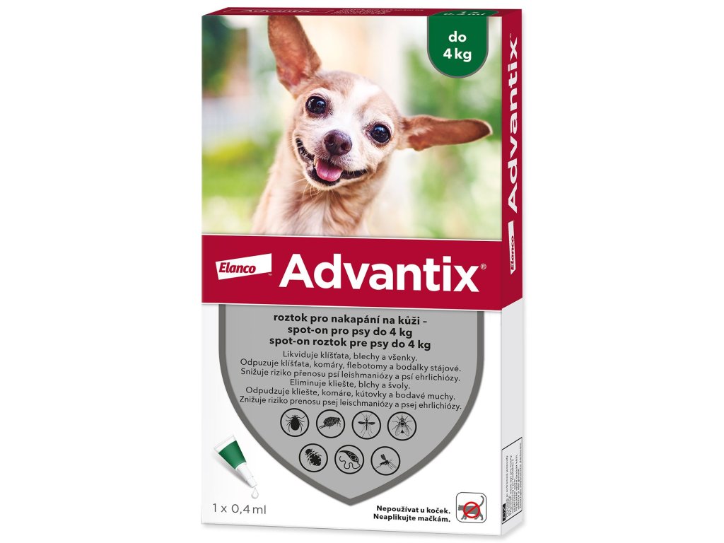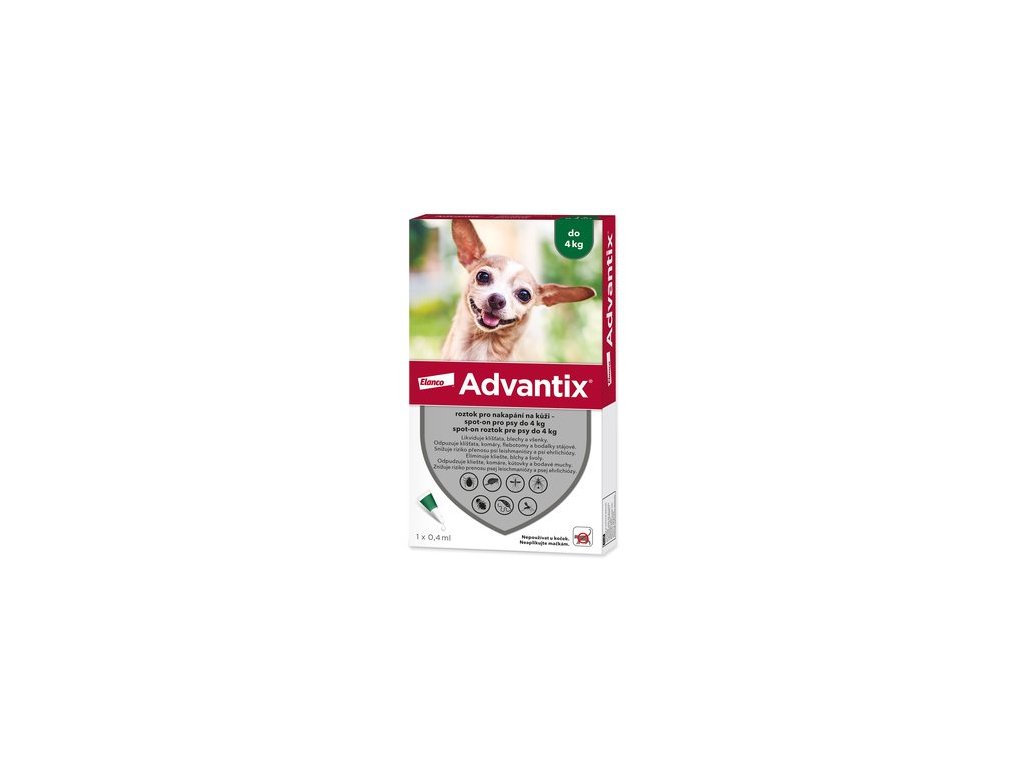 Advantix 100 mg + 500 mg roztok pro nakapání na kůži – spot-on pro psy (< 4 kg) je veterinární léčivý přípravek. Před použitím si pečlivě přečtěte příbalovou informaci