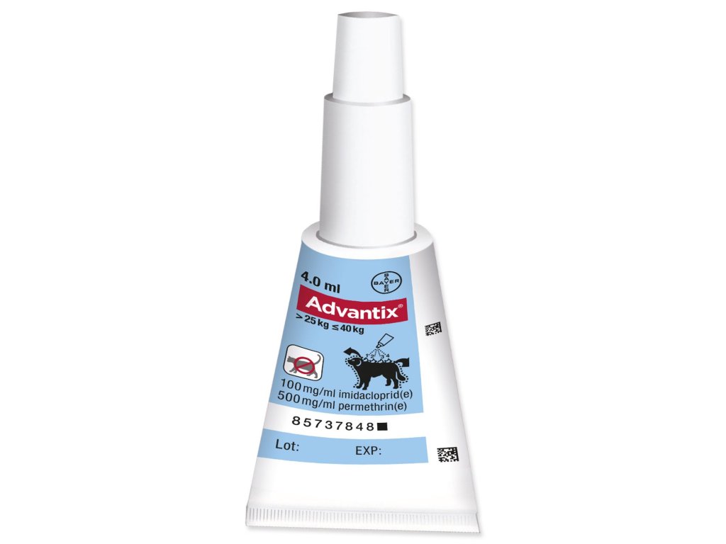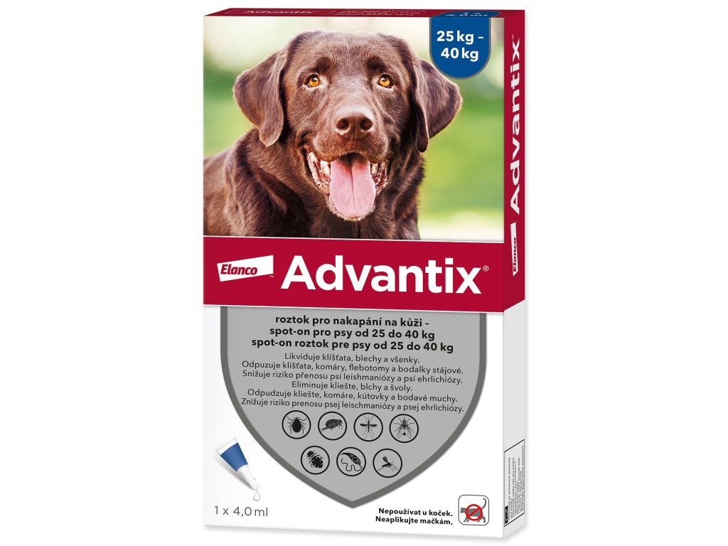 Advantix 100 mg + 500 mg roztok pro nakapání na kůži – spot-on pro psy (>25 kg < 40 kg) je veterinární léčivý přípravek. Před použitím si pečlivě přečtěte příbalovou informaci