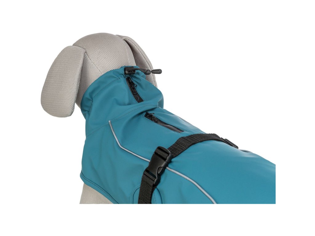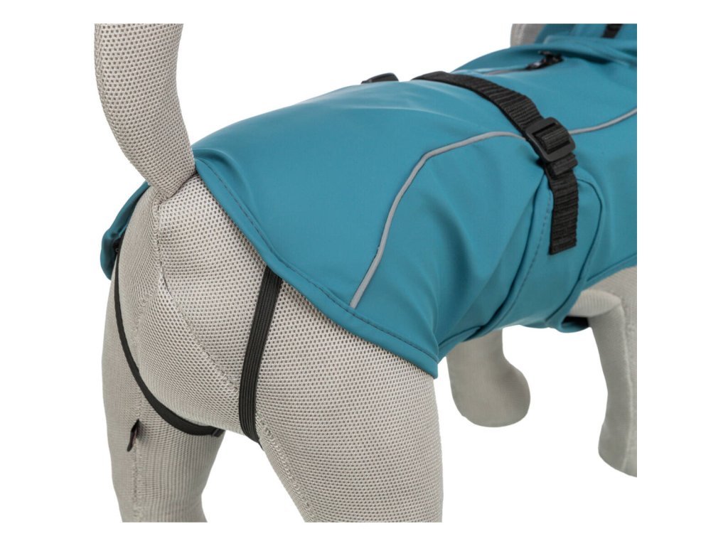 Pro větší komfort má pláštěnka extra vysoký límec se stahovací šňůrkou, který chrání krk před deštěm i větrem. Nastavitelný břišní popruh s přezkou zajistí pevné uchycení, zatímco smyčky na zadní nohy brání posouvání při pohybu. Reflexní pásky navíc zvyšují viditelnost a tím i bezpečnost psa při večerních vycházkách 🌙.