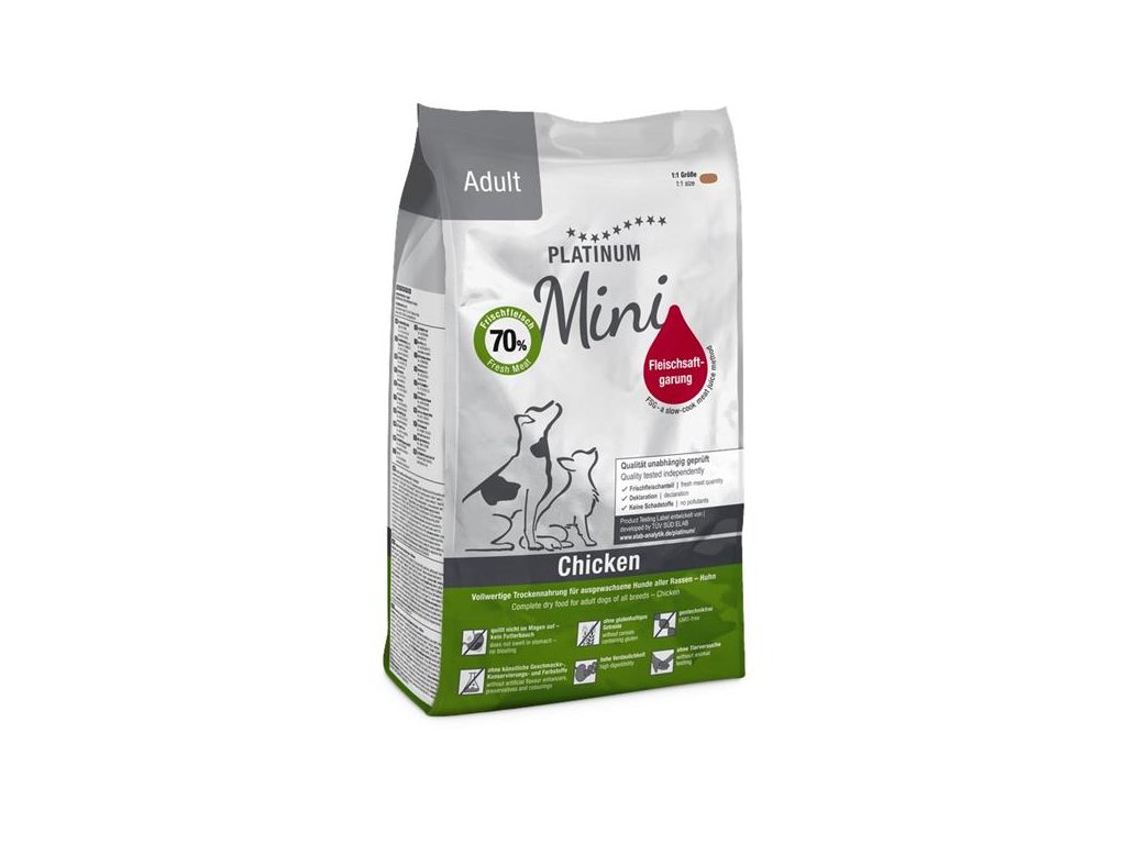 Polovlhké krmivo Platinum Mini Adult Chicken je snadno stravitelné a psi jeho chuť milují. Splňuje nutriční požadavky pro dospělé a aktivní psy ve sportovní nebo pracovní zátěži. Vyvážené složení podporuje pevné zdraví a vitalitu. Velikost granulí je speciálně uzpůsobená pro malá plemena. Granule jsou přirozeně bezlepkové, obsahují 70 % čerstvého kuřecího masa připravovaného unikátní metodou Fleischsaftgarung (vaření ve vlastní šťávě ve vakuu za nízkých teplot). Přidané pivovarské kvasnice podporují trávení, výtažek ze slávky zelenoústé kosti i svaly a omega-3 a omega-6 mastných kyselin kvalitu srsti. V granulích Platinum navíc nenajdete ani špetku soli, konzervanty ani umělá barviva. Granule jsou balené do alu-foliových pytlů, které zachovají čerstvost a vůni do posledního sousta.