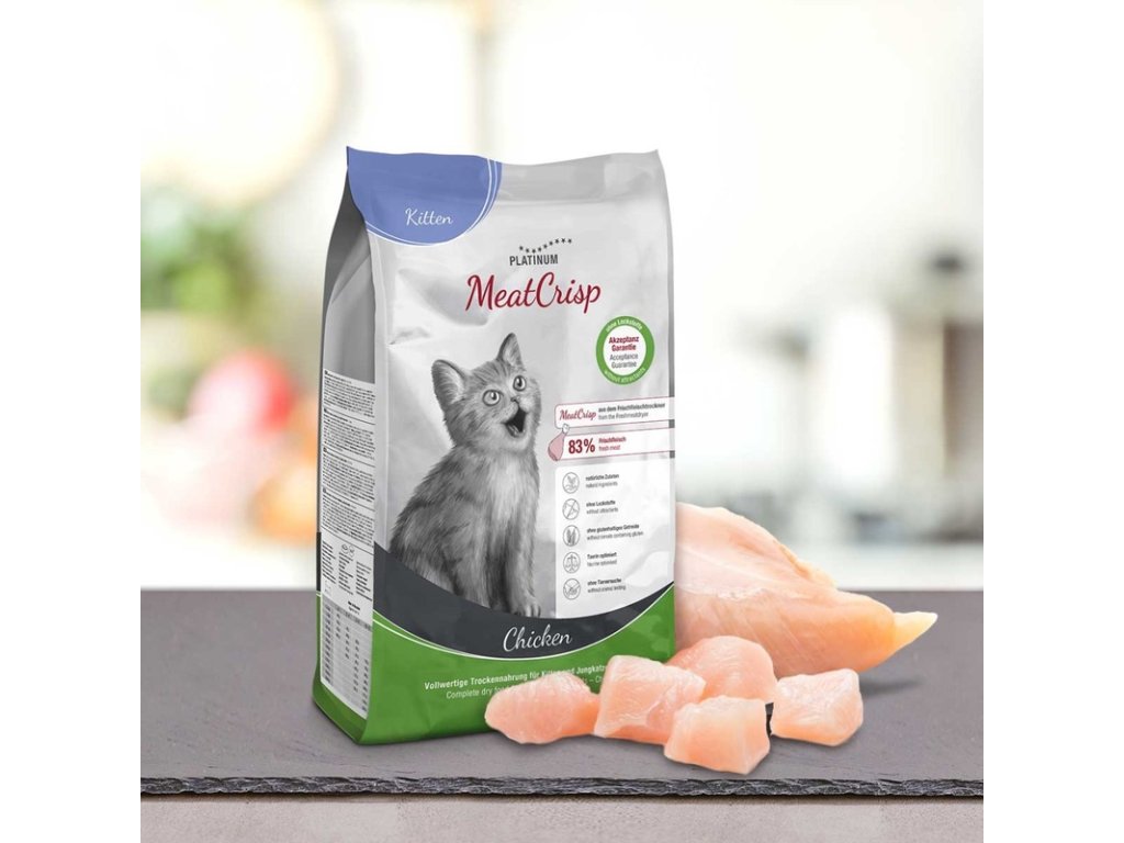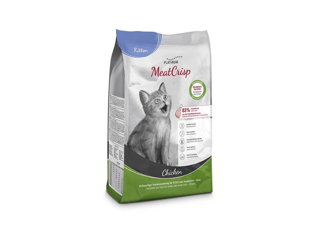 Kompletní suché krmivo Platinum MeatCrisp pro koťata a dospívající kočky obsahuje 83 % čerstvého kuřecího masa připravovaného unikátní metodou Freshmeatdryer, při níž se do sušičky, kde při nízké teplotě cirkuluje vzduch, vloží čerstvé maso s dalšími přísadami. Pomalé a rovnoměrné sušení zachovává přirozenou chuť masa i důležité živiny. Proto jsou granule MeatCrisp zdravé, křupavé, plné chuti a neodolá jim ani ten nejmlsnější kočičí jazýček.