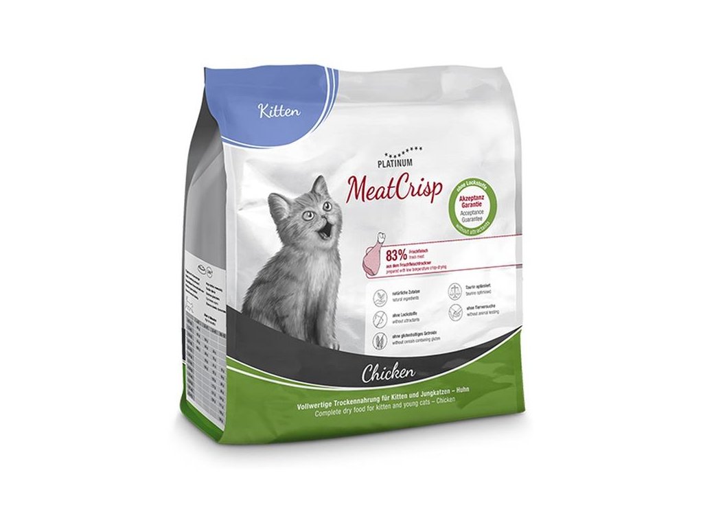 Kompletní suché krmivo Platinum MeatCrisp pro koťata a dospívající kočky obsahuje 83 % čerstvého kuřecího masa připravovaného unikátní metodou Freshmeatdryer, při níž se do sušičky, kde při nízké teplotě cirkuluje vzduch, vloží čerstvé maso s dalšími přísadami. Pomalé a rovnoměrné sušení zachovává přirozenou chuť masa i důležité živiny. Proto jsou granule MeatCrisp zdravé, křupavé, plné chuti a neodolá jim ani ten nejmlsnější kočičí jazýček.