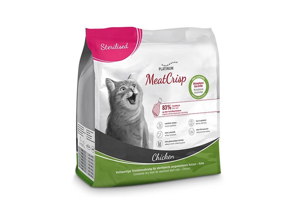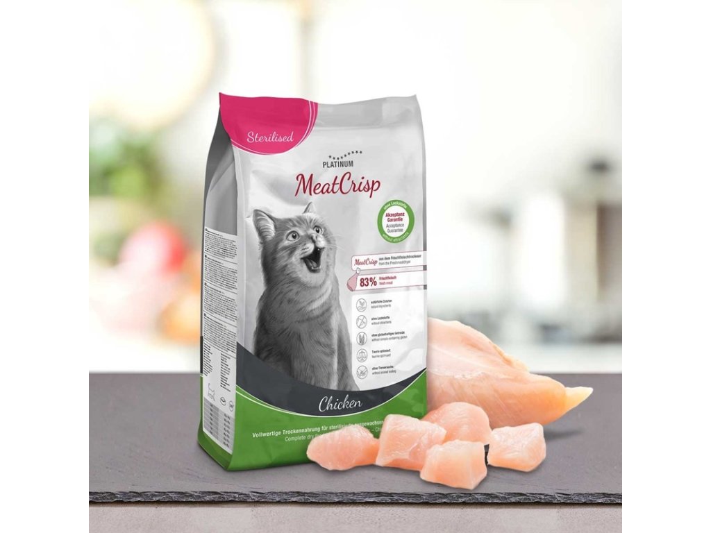Kompletní bezlepkové krmivo Platinum MeatCrisp pro kastrované kočky obsahuje 83 % čerstvého kuřecího masa připravovaného unikátní metodou Freshmeatdryer, při níž se do sušičky, kde při nízké teplotě cirkuluje vzduch, vloží čerstvé maso s dalšími přísadami. Pomalé a rovnoměrné sušení zachovává přirozenou chuť masa i důležité živiny. Proto jsou granule MeatCrisp zdravé, křupavé, plné chuti a neodolá jim ani ten nejmlsnější kočičí jazýček.