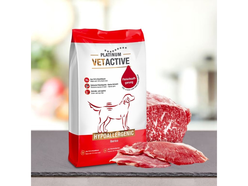 Polovlhké grain-free monoproteinové krmivo Platinum Vetactive Hypoallergenic je ideální pro psy s potravinovými alergiemi nebo intolerancí. Pečlivě vybrané ingredience pouze s jedním zdrojem masa (iberijským vepřem) dělají z krmiva skutečný kulinářský zážitek a minimalizují riziko alergických reakcí. Maso je navíc připravované unikátní metodou Fleischsaftgarung (vaření ve vlastní šťávě ve vakuu za nízkých teplot) pro ještě větší chutnost, šťavnatost a zachování živin.