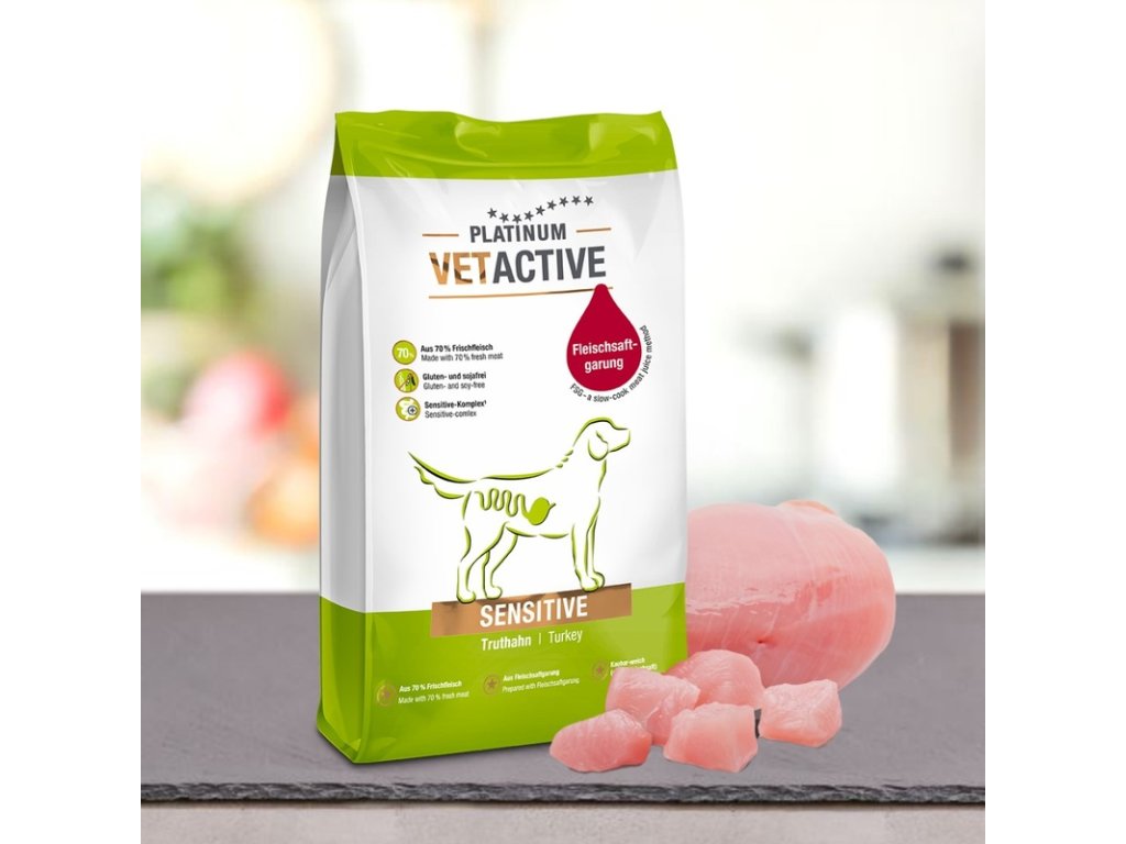 Polovlhké monoproteinové krmivo Platinum Vetactive Sensitive je speciálně navržené pro psy s gastrointestinální citlivostí, kteří trpí častými průjmy a žaludečními potížemi.* Kompletní krmivo s pečlivě vybranými a lehce stravitelnými složkami představuje pro citlivé psy skutečný kulinářský zážitek. Bezlepkové granule jsou vyrobené z vysoce kvalitních surovin a neobsahují žádné umělé přísady ani konzervační látky. Maso je navíc připravované unikátní metodou Fleischsaftgarung (vaření ve vlastní šťávě ve vakuu za nízkých teplot) pro ještě větší chutnost, šťavnatost a zachování živin.