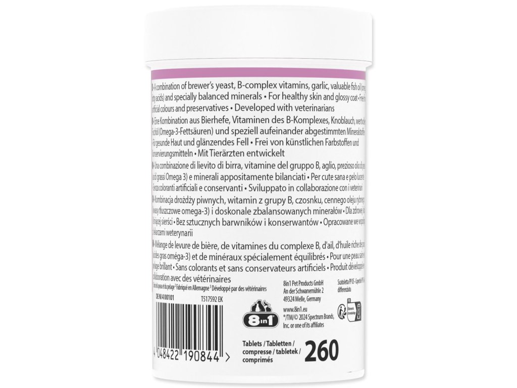 Pochoutka 8in1 Pivovarské kvasnice 260 tablet je skvělý každodenní doplňkový přípravek pro psy, který podporuje zdravou kůži, lesklou srst a celkovou vitalitu. 🐶✨ Tablety kombinují účinky pivovarských kvasnic, vitamínů skupiny B, česneku, rybího oleje a přírodních antioxidantů – vše pro krásný vzhled srsti a správnou funkci organismu vašeho psa.