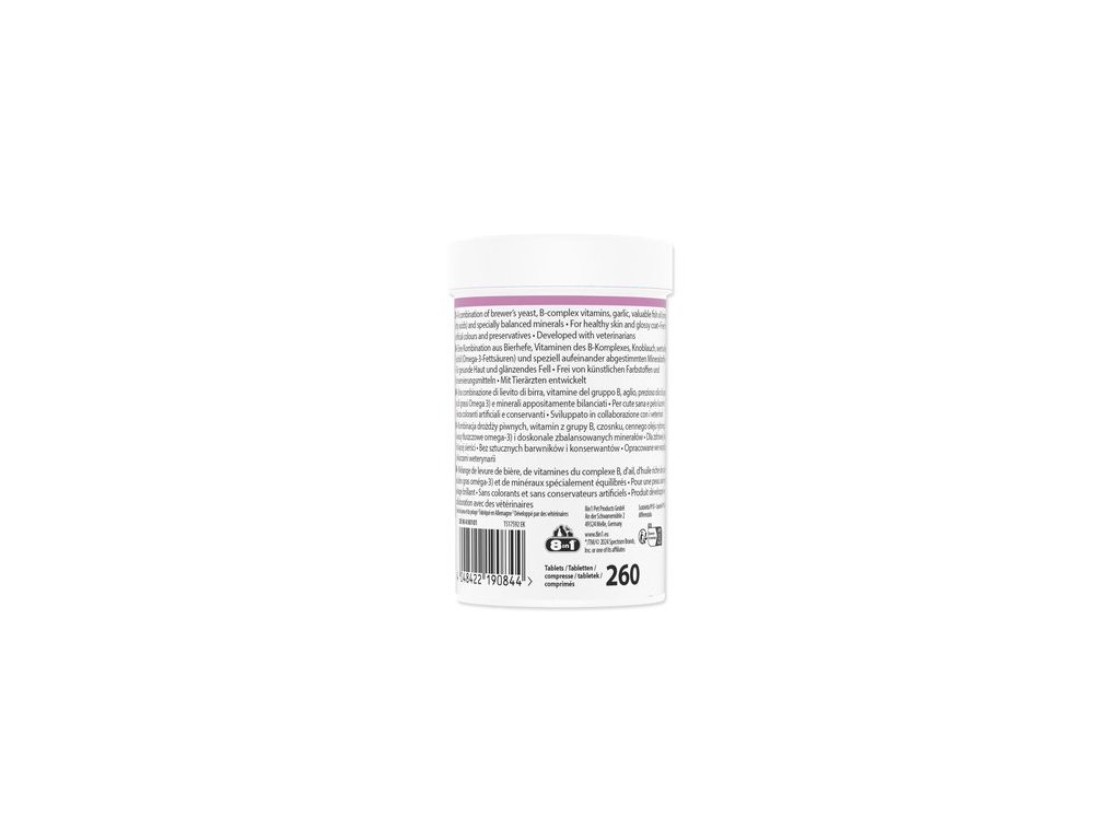 Kombinace pivovarských kvasnic, vitamínů skupiny B, česneku, rybího oleje a vyvážených minerálů zajišťuje vašemu psovi správnou výživu pro zdravou kůži a srst.