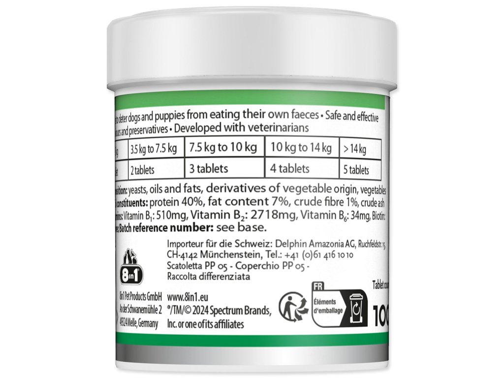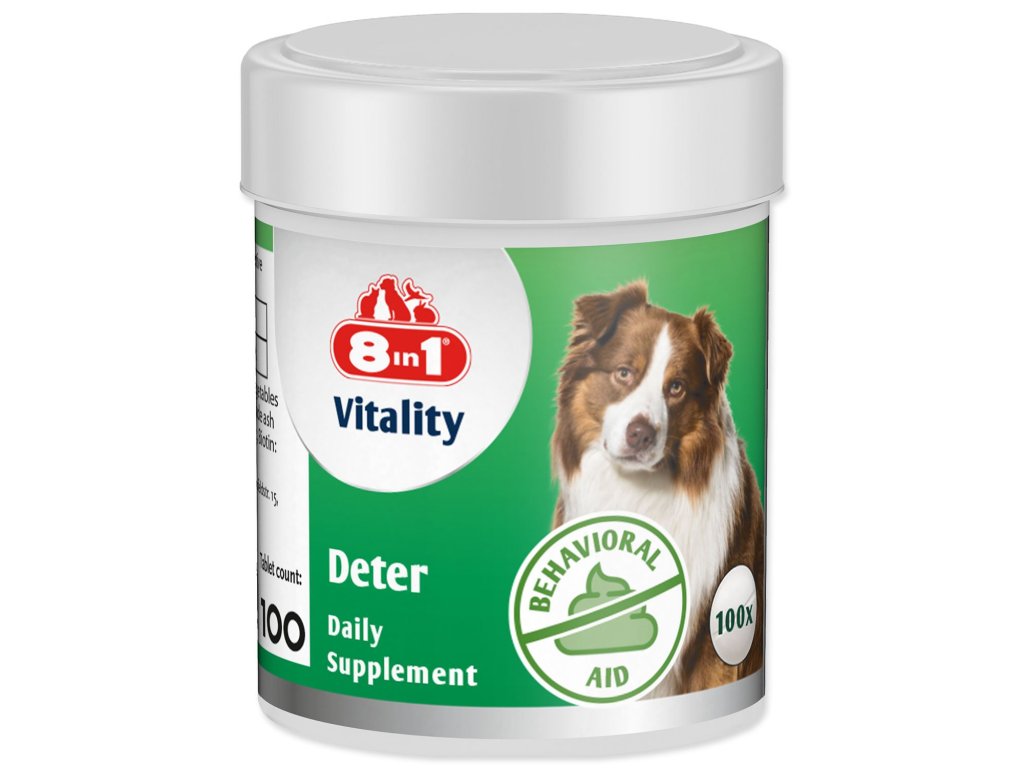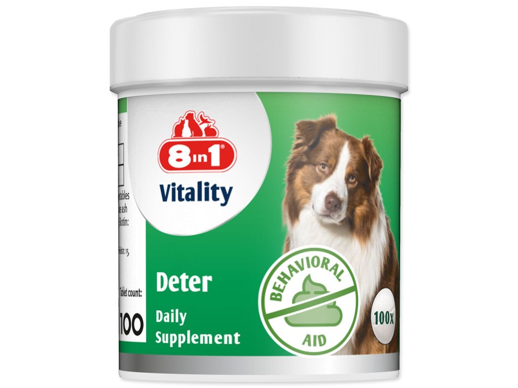 Tablety 8v1 Deter jsou ideálním denním doplňkem pro psy, který pomáhá zabránit a odradit je od konzumace vlastních výkalů (koprofágie). Vyvinuto ve spolupráci s veterináři, obsahuje kvasnice, rybí oleje, zeleninu a širokou škálu vitamínů a minerálů. Tablety 8v1 Deter jsou určeny pro psy a štěňata a bez umělých barviv a konzervantů. Produkt je vyroben v Německu.