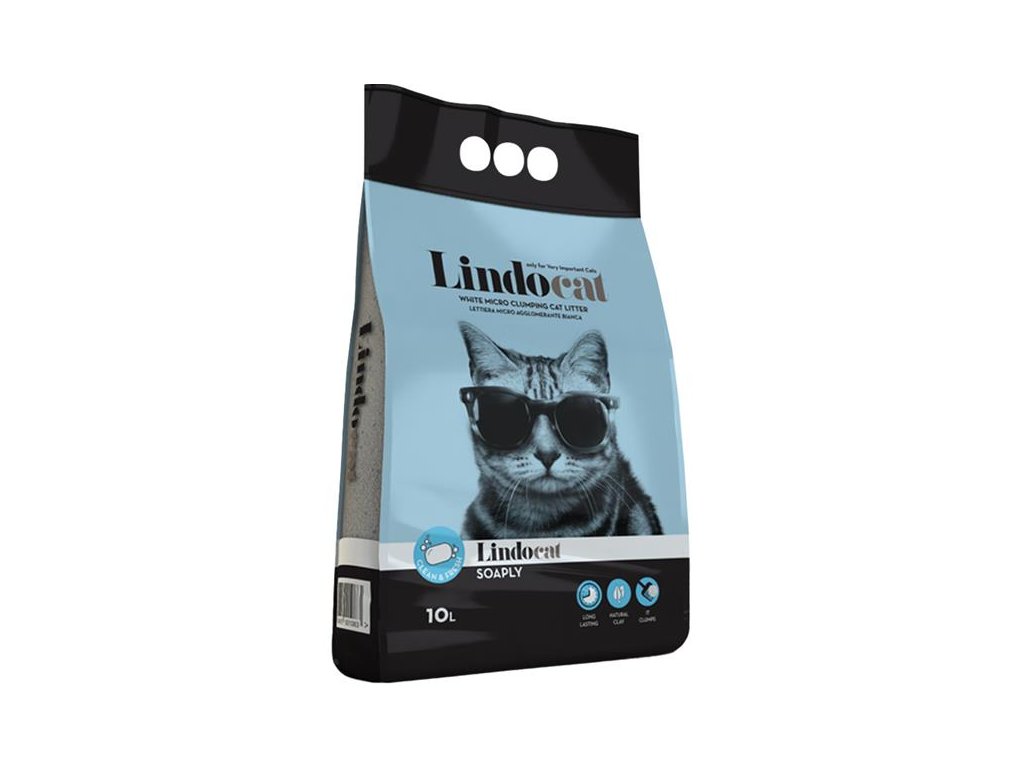 Lindocat Soaply s jemnou vůní mýdla je hrudkující neprašné stelivo vyrobené ze 100% přírodního bílého bentonitu se světle modrými granulkami. Díky svému složení a drobné velikosti zrn rychle a pevně hrudkuje a účinně absorbuje tekutiny a pachy. Hrudky se vybírají snadno a s minimálními ztrátami steliva.