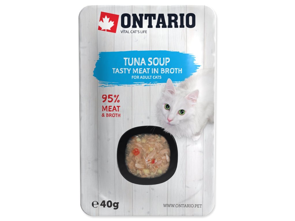 Doplňkové krmivo pro dospělé kočky – polévka s kousky tuňáka, kterou můžete dopřát samostatně nebo jako doplněk k suchému krmivu.