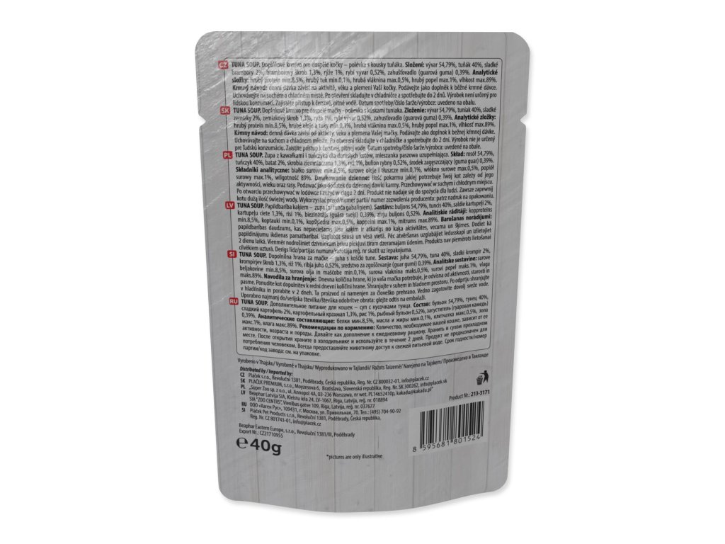 Vývar 54,79%, tuňák 40%, sladké brambory 2%, bramborový škrob 1,3%, rýže 1%, rybí vývar 0,52%, zahušťovadlo (guarová guma) 0,39%.