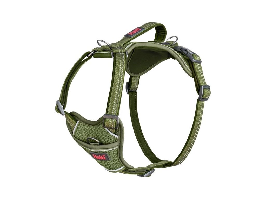 Halti Anatomy Harness je pohodlný a bezpečný postroj pro dospělé psy konstruovaný s respektem k jejich anatomii. Při jeho vývoji byly zohledněny výsledky vědeckých studií vlivu omezujících prostředků na psí zdraví. Jde o vysoce komfortní postroj vhodný jak pro běžné venčení, tak pro náročnější aktivity. Psovi zajišťuje naprostou volnost pohybu při chůzi i v běhu, žádným způsobem neomezuje pohyb ramen a rovnoměrně rozkládá tlak. Hrudní a zádový díl jsou vyklenuté, aby lépe kopírovaly psí tělo, a polstrované neoprenem pro větší pohodlí. Vodítko lze k postroji připnout na 3 místech: kroužek za krkem je ideální pro chůzi nebo pro připnutí psí známky, kroužek na zádech pro turistiku či běh a kroužek na hrudi pro regulaci tahání a skákání. Hřbetní rukojeť slouží k asistenci psovi nebo k jeho přidržení. Díky vysoce odrazivému prošití popruhů a lemování hrudního i zádového dílu je postroj reflexní ze všech stran a zvyšuje tak bezpečnost psa za zhoršené viditelnosti.