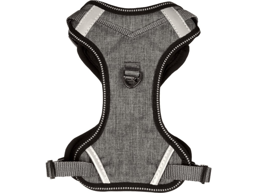 Hrudní postroj pro psy Flamingo Heron je vyroben z pevného a voděodolného nylonu a má měkkou neoprenovou podšívku. Postroj je plně nastavitelný, takže lze snadno přizpůsobit tvaru těla psa. Zapíná se pomocí dvou plastových přezek. Pro připnutí vodítka slouží kovové kroužky s matně šedou povrchovou úpravou – jeden na zádech a jeden na hrudi, který pomáhá lépe regulovat tahání a skákání. Pro vyšší bezpečnost je postroj opatřen reflexními prvky. Navíc je vybaven praktickou hřbetní rukojetí pro lepší kontrolu psa v náročných situacích.