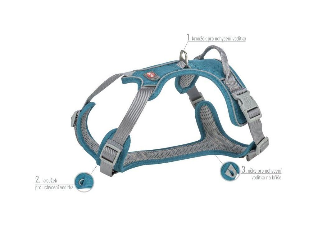 3. očko pro upevnění vodítka na břiše - popruhy na krku a hrudníku jsou plynule nastavitelné