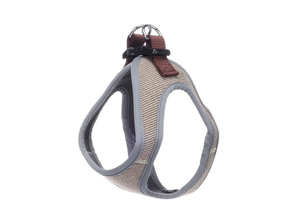 Hrudní postroj z odolného nylonu je opatřen plastovou přezkou na zapínání a dvěma chromovanými D-kroužky k připnutí vodítka. Pro větší pohodlí psa jsou okraje postroje obšité pevným lemem.