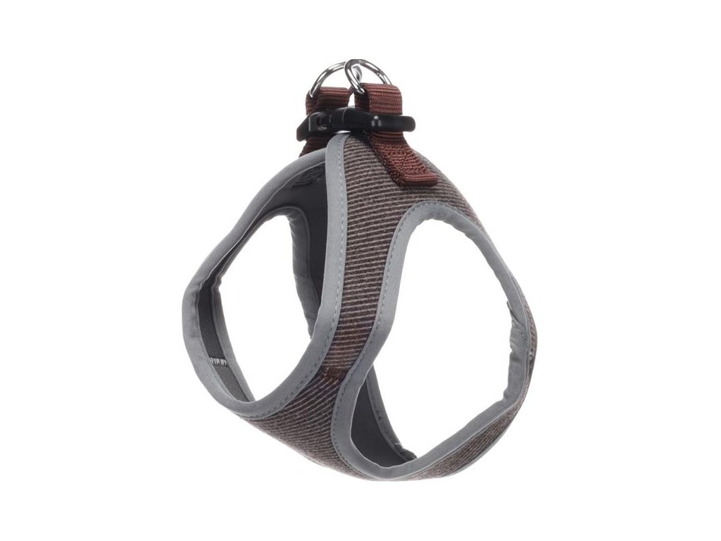 Hrudní postroj z odolného nylonu je opatřen plastovou přezkou na zapínání a dvěma chromovanými D-kroužky k připnutí vodítka. Pro větší pohodlí psa jsou okraje postroje obšité pevným lemem.