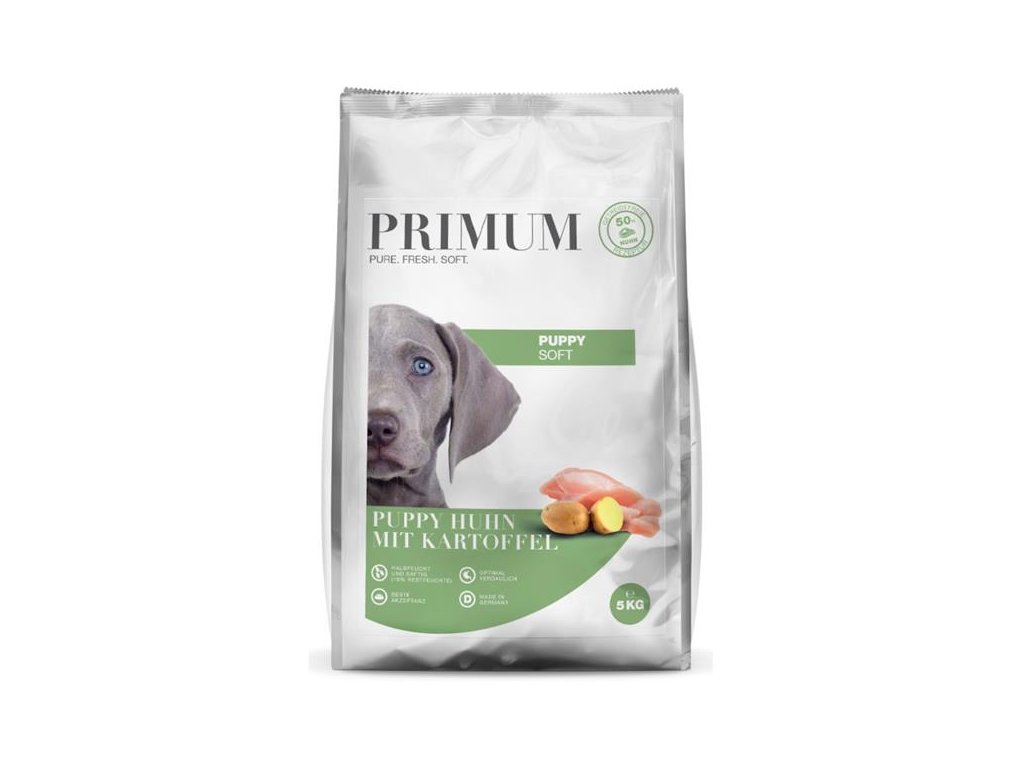 Polovlhké granule Primum Puppy Soft Chicken obsahují čerstvé kuře (50 %) jako jediný zdroj živočišných bílkovin a neobsahují žádné obiloviny. Ty jsou v receptuře nahrazené bramborami. Krmivo je díky tomu ideální pro štěňata všech plemen od 8. týdne věku pro zdravý růst a optimální vývoj a je vhodné pro mladé psy s citlivým zažíváním, potravinovou intolerancí nebo alergií. Kvalitní suroviny jsou vařeny pomalu a šetrně ve vlastní šťávě, díky čemuž si krmivo uchovává živiny, vysokou zbytkovou vlhkost a je vysoce chutné. Nutriční hodnotu krmiva zvyšují přidané byliny s řadou zdraví prospěšných účinků a chondroitin s glukosaminem pro podporu pohybového aparátu.