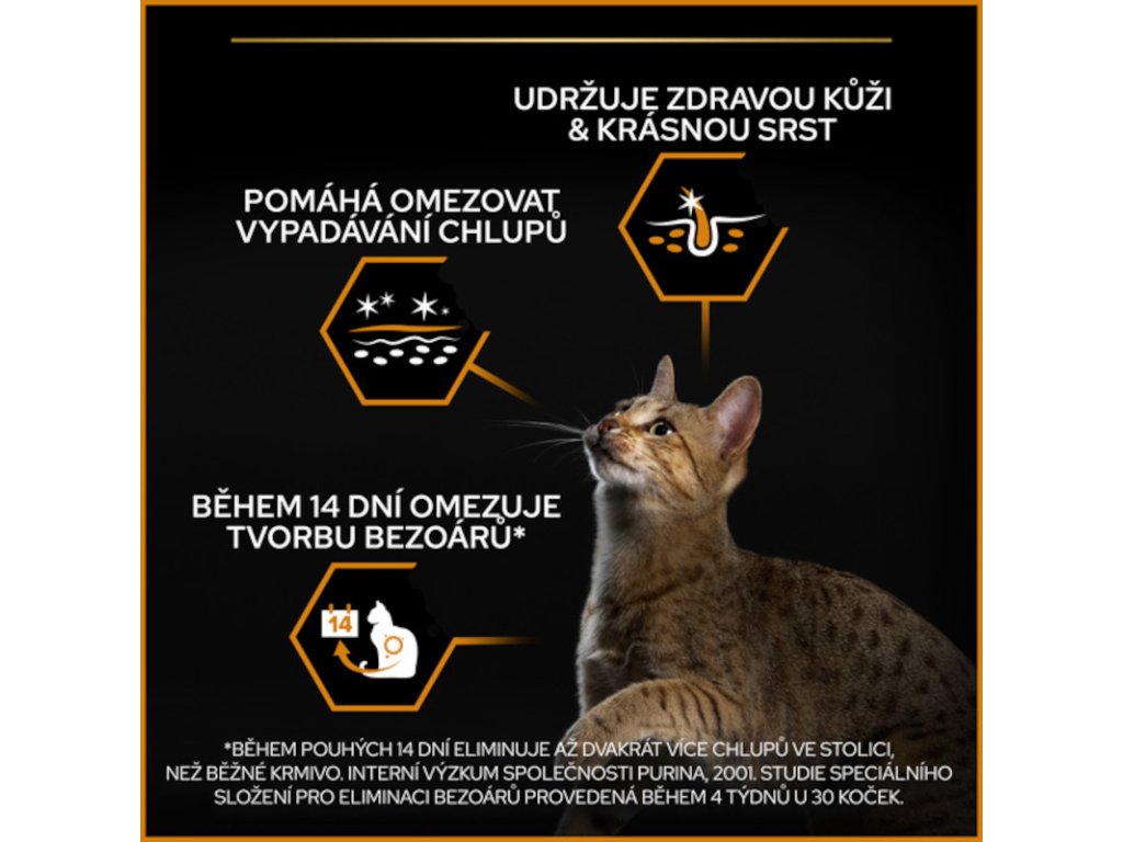 Obsahuje OPTIDERMA® - specifickou patentovanou kombinaci živin, která prokazatelně udržuje zdravou kůži, krásnou a lesklou srst. Omezuje tvorbu smotků chlupů a bezpečně pomáhá jejich průchodu trávicím traktem. Pomáhá omezit nadměrné vypadávání chlupů/línání. Vysoce chutná receptura, která uspokojí i ty nejmlsnější kočky.