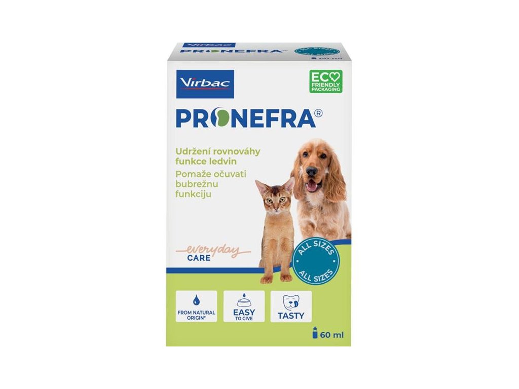 Kočky 1 ml na 4 kg ž. hm., psi 1 ml na 5 kg ž. hm. dvakrát denně. Voda by měla být k dispozici neomezeně. Nepřekračujte doporučené dávkování. Před použitím požádejte o radu svého veterinárního lékaře. PRONEFRA® nemusí být vhodná pro některá stará zvířata nebo léčená se specifickou trávící citlivostí související s jejich zdravím.