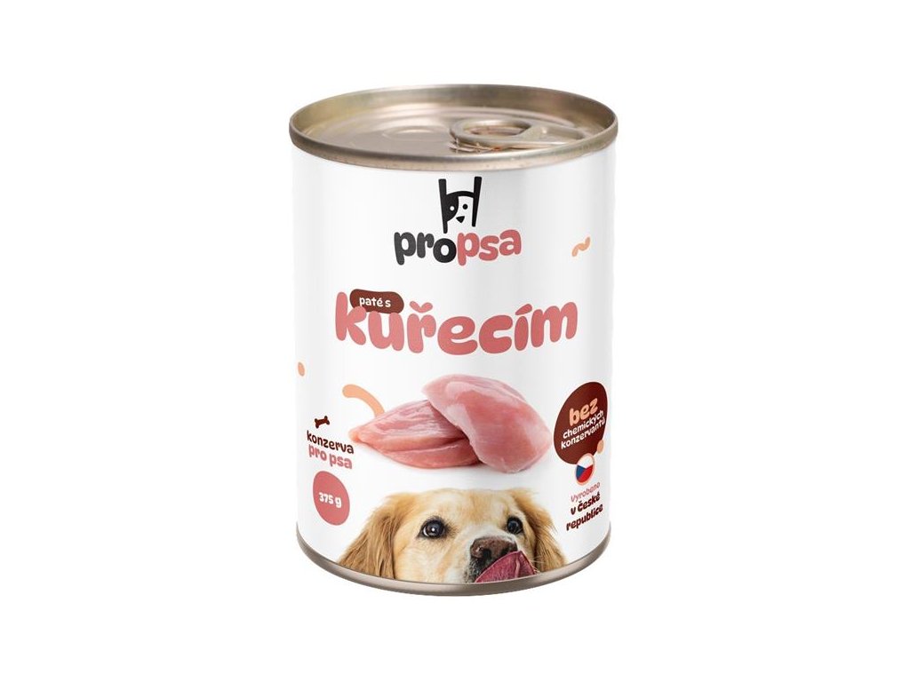 Propsa paté s kuřecím je kvalitní kompletní krmivo pro psy všech plemen za výhodnou cenu. Konzerva je vyrobená v České republice pouze z přírodních ingrediencí bez použití chemických konzervantů a dochucovadel.