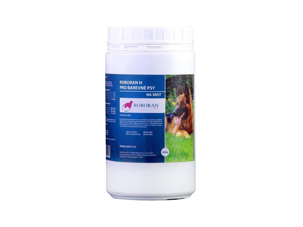 Roboran H pro barevné psy - doplněk biologicky účinných látek pro psy. Vhodnou kombinací komponent je dosaženo výrazného zlepšení kvality a zbarvení srsti a zdravotního stavu kůže. Obsahuje chuťový doplněk, pro který jej psi rádi přijímají.
