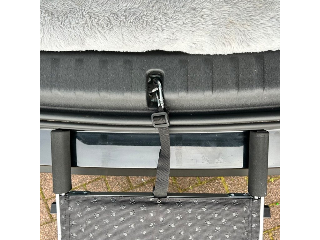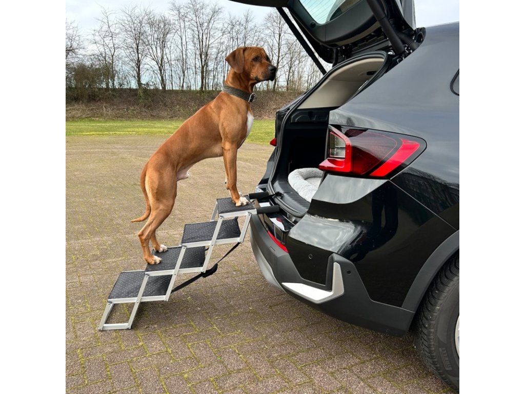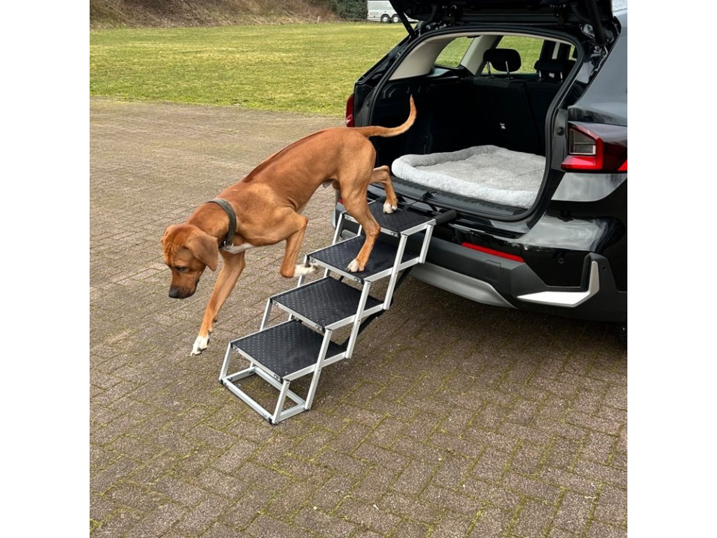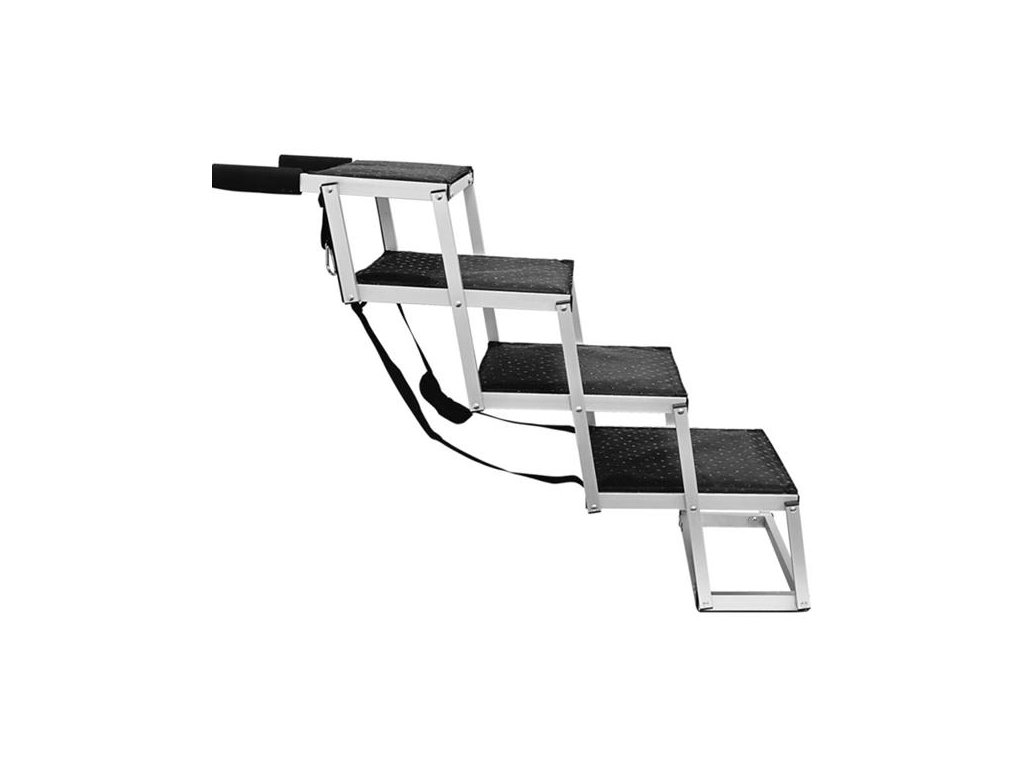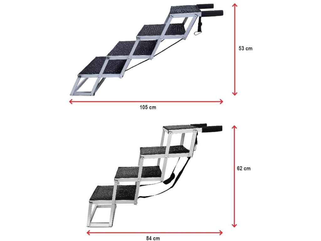 Skládací čtyřstupňové schůdky z hliníku pro psy do hmotnosti 75 kg lze plynule nastavit pro výšku 53–62 cm. Jsou vhodné k bezpečnému nástupu do nebo sestupu z auta či jiných vyvýšených míst, a to jak pro psy s pohybovými obtížemi, tak pro prevenci problémů s klouby a páteří u štěňat. Mají protiskluzový povrch, polstrovanou horní vzpěru, gumou podložený spodní schůdek a praktické madlo pro snadné přenášení. Pomocí karabiny je lze připnout k zámku kufru auta a tím zajistit jejich stabilitu během používaní.