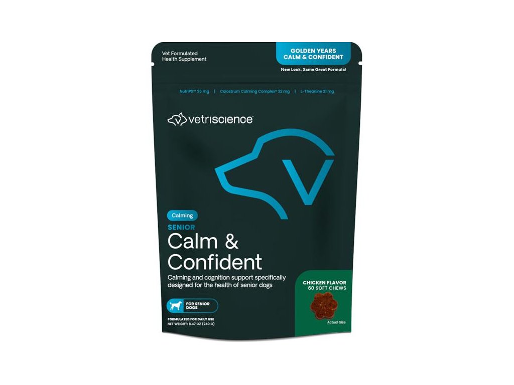 Calm & Confident je speciálně vyvinut pro starší psy, aby pomohl zvládnout problémy stárnutí související s chováním zvířete, jako je například zmatenost či dezorientace. Klíčové složky Směs biopeptidů Colostrum Calming Complex® a čajový extrakt napomáhají podpoře kognitivních funkcí a klidného chování. Je klinicky prokázáno, že patentovaná forma fosfatidylserinu (Sharp-PS® Green) podporuje správnou funkci mozku, paměť a učení u stárnoucích psů. Pamlsky s příchutí kuřecích jater se snadno rozdělí na kousky a jsou vhodné pro psy s citlivým zažíváním. Účinné látky Calm & Confident Colostrum Calming Complex® Čajový extrakt 5250 mg/kg Doporučené dávkování žvýkacích pamlsků do 14 kg 1 žvýkací kousek denně 14–27 kg 2 žvýkací kousky denně nad 27kg 3 žvýkací kousky denně Přípravek lze podávat denně nebo podle potřeby. Dávku je možno až ztrojnásobit v období zvýšeného stresu. Přípravek není návykový. Jedno balení obsahuje 60 žvýkacích kousků. Hmotnost 240g Neaktivní složky: Ovesná mouka, žitná mouka, pivovarské kvasnice, řepkový olej, síran vápenatý bezvodý, citrusový pektin, glycerin, aroma kuřecích jater, maltodextrin, řepná melasa, sójový lecitin, fosfatidylserin 25 mg, kolostrum 22 mg. Vyrobeno v USA z domácích a dovezených surovin.