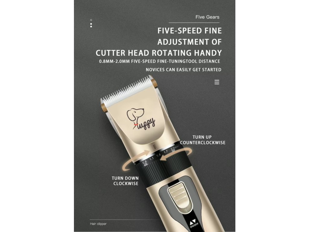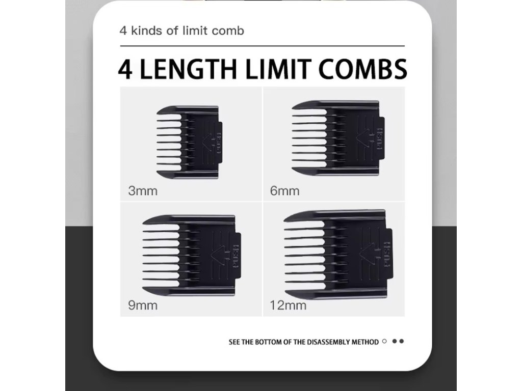 Nastavitelný hřebenový nástavec umožňuje úpravu srsti různých délek; odnímatelné hřebeny se snadno mění a rozšiřují možnosti použití.