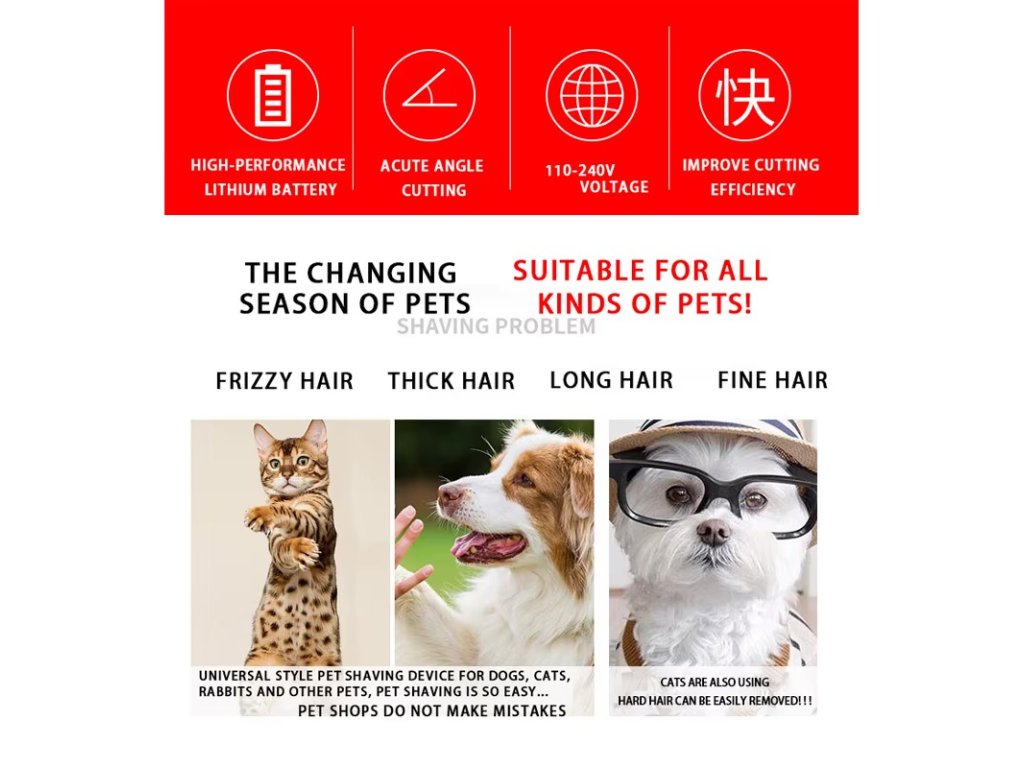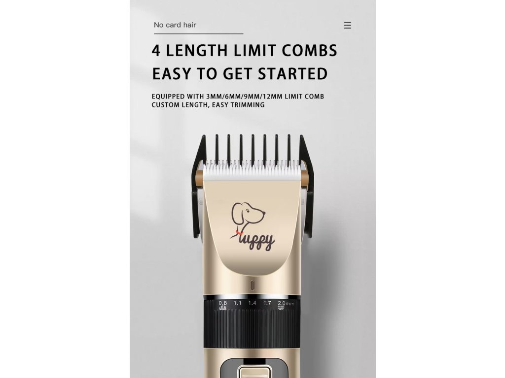 Nastavitelný hřebenový nástavec umožňuje úpravu srsti různých délek; odnímatelné hřebeny se snadno mění a rozšiřují možnosti použití.