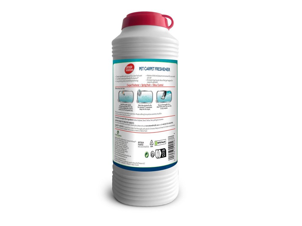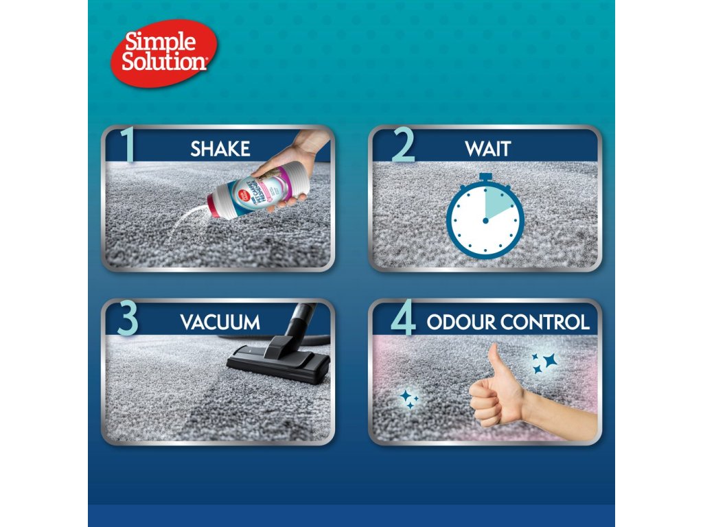 Zbavte se přetrvávajících pachů od mazlíčků snadno a rychle. Simple Solution osvěžovač koberců neutralizuje zápachy hluboko v koberci i čalounění díky účinné receptuře s "Pro-bakteriemi".