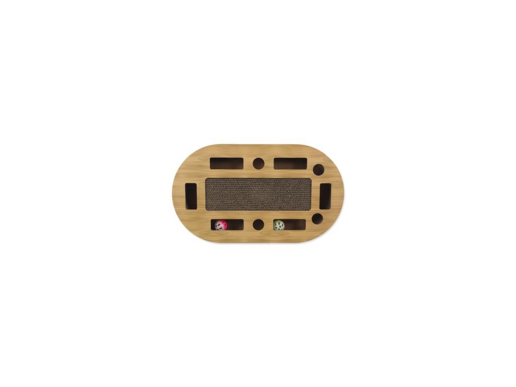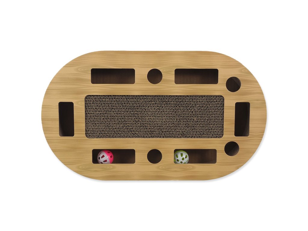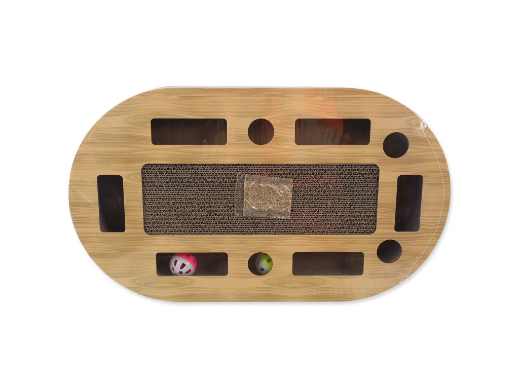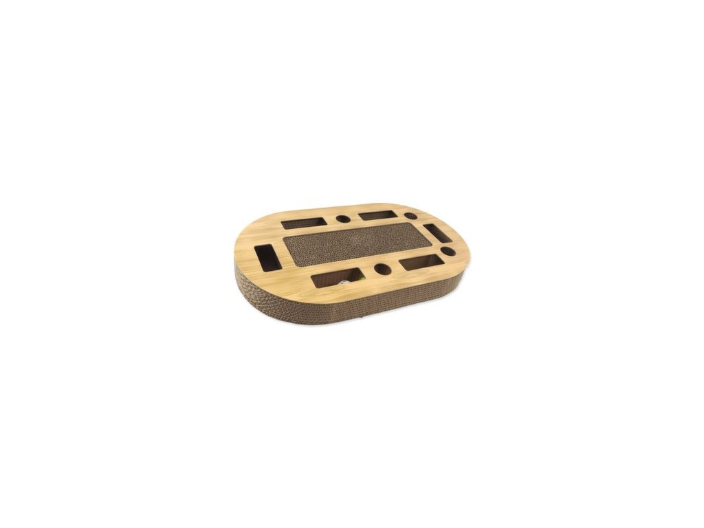 Interaktivní kartonové škrabadlo pro kočky se šantou, barevné provedení ve vzoru dub.