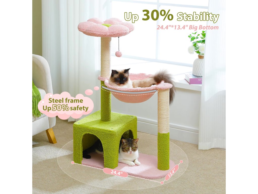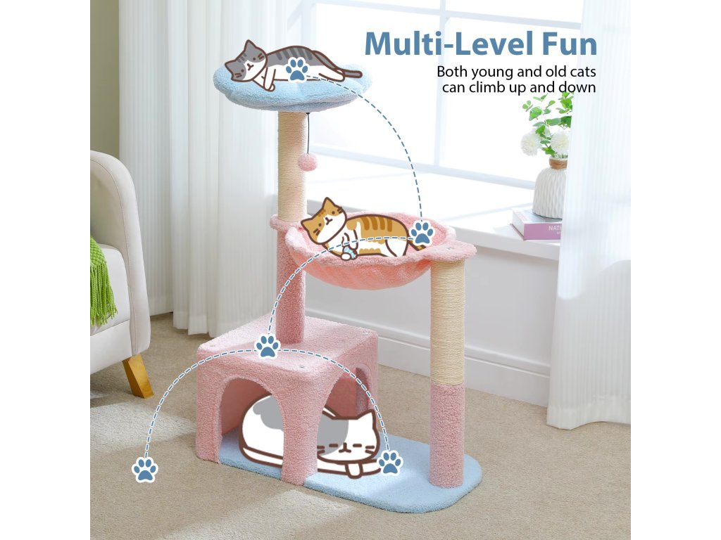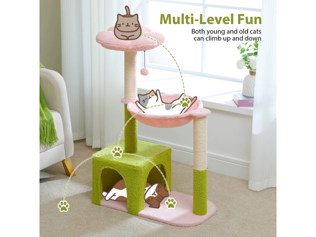 Multifunkční kočičí strom, je nejen estetický kousek nábytku do vašeho bytu, ale i komplexní herní a odpočinková zóna pro vaši kočičku. Škrabadlo má domeček, ve kterém může kočička odpočívat a sisalové sloupky, které skvěle poslouží k přirozenému obrušování drápků a kočička tak nebude ničit váš nábytek. Strom disponuje i prohlubní/pelíškem na ležení a malou kuličkou na hraní, kterou lze dle potřeby odmontovat. Je vyroben z vysoce kvalitních přírodních desek, materiálu šetrného k pokožce a přírodního sisalového materiálu a je navržen tak, aby nabízel bezpečné a pohodlné místo pro vaše mazlíčky. Výška tohoto kočičího stromu je 93 cm.