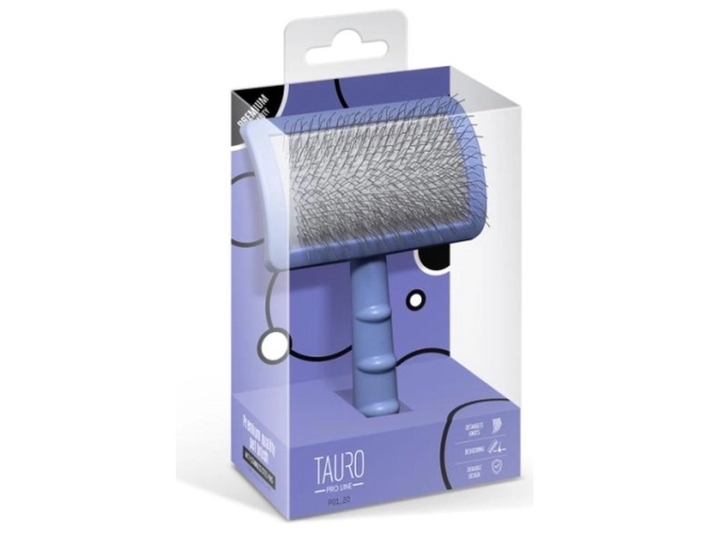 Prémiový kartáč Tauro Pro Line je navržen pro pohodlné kartáčování psů a koček všech plemen a typů srsti. Ergonomická rukojeť a nízká hmotnost snižují únavu ruky během kartáčování. Měkčí drátky z nerezové oceli zahnuté v úhlu 135° pročešou srst, načechrají ji, odstraní odumřelé chlupy a poskytnou jemnou masáž, která zlepšuje krevní oběh a podporuje růst nových chlupů. Kartáč snadno vyčeše i hůře dostupná místa: podpaží, čenich, uši a tlapky. Srst je po česání hladší a lesklejší i díky speciálnímu antistatickému povrchu kartáče, který zabraňuje hromadění elektrického náboje.