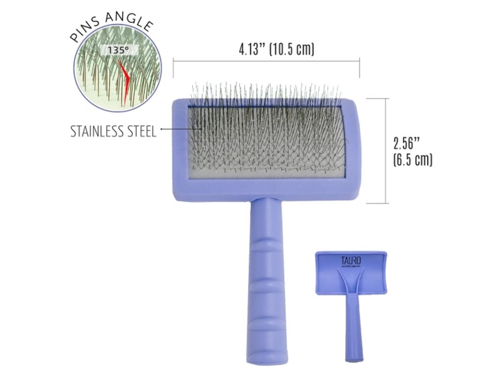 Prémiový kartáč Tauro Pro Line je navržen pro pohodlné kartáčování psů a koček všech plemen a typů srsti. Ergonomická rukojeť a nízká hmotnost snižují únavu ruky během kartáčování. Tvrdší drátky z nerezové oceli zahnuté v úhlu 135° pročešou srst, načechrají ji, odstraní odumřelé chlupy a poskytnou jemnou masáž, která zlepšuje krevní oběh a podporuje růst nových chlupů. Kartáč snadno vyčeše i hůře dostupná místa: podpaží, čenich, uši a tlapky. Srst je po česání hladší a lesklejší i díky speciálnímu antistatickému povrchu kartáče, který zabraňuje hromadění elektrického náboje.