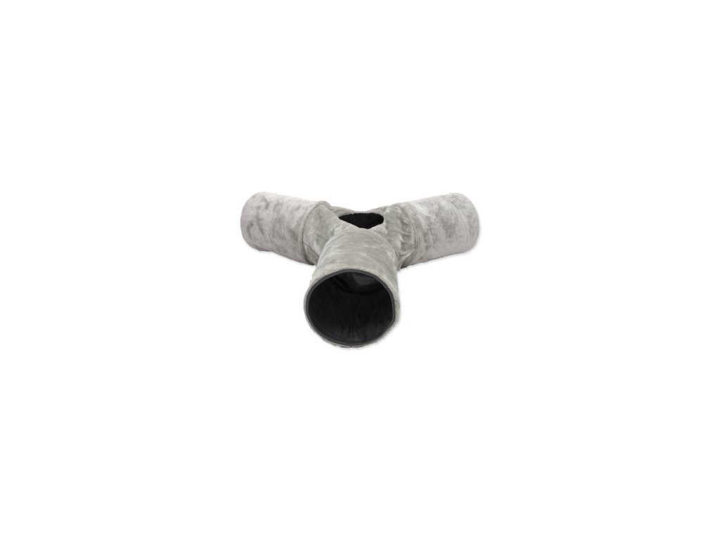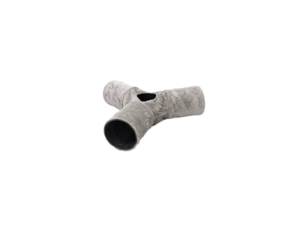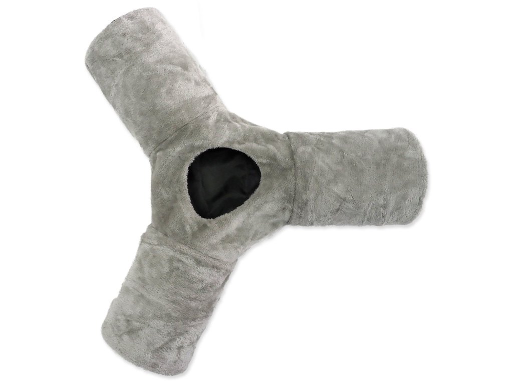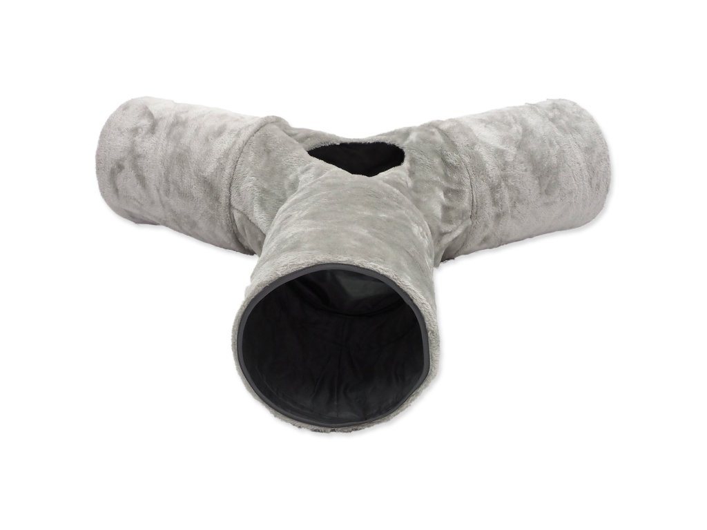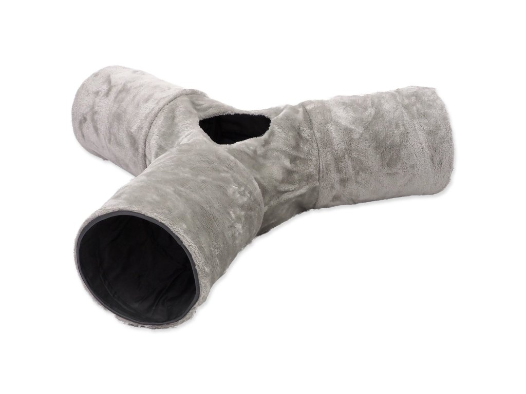 Tunel pro kočky se ve tvaru písmene „Y“ s otvorem uprostřed pro zábavnou hru.