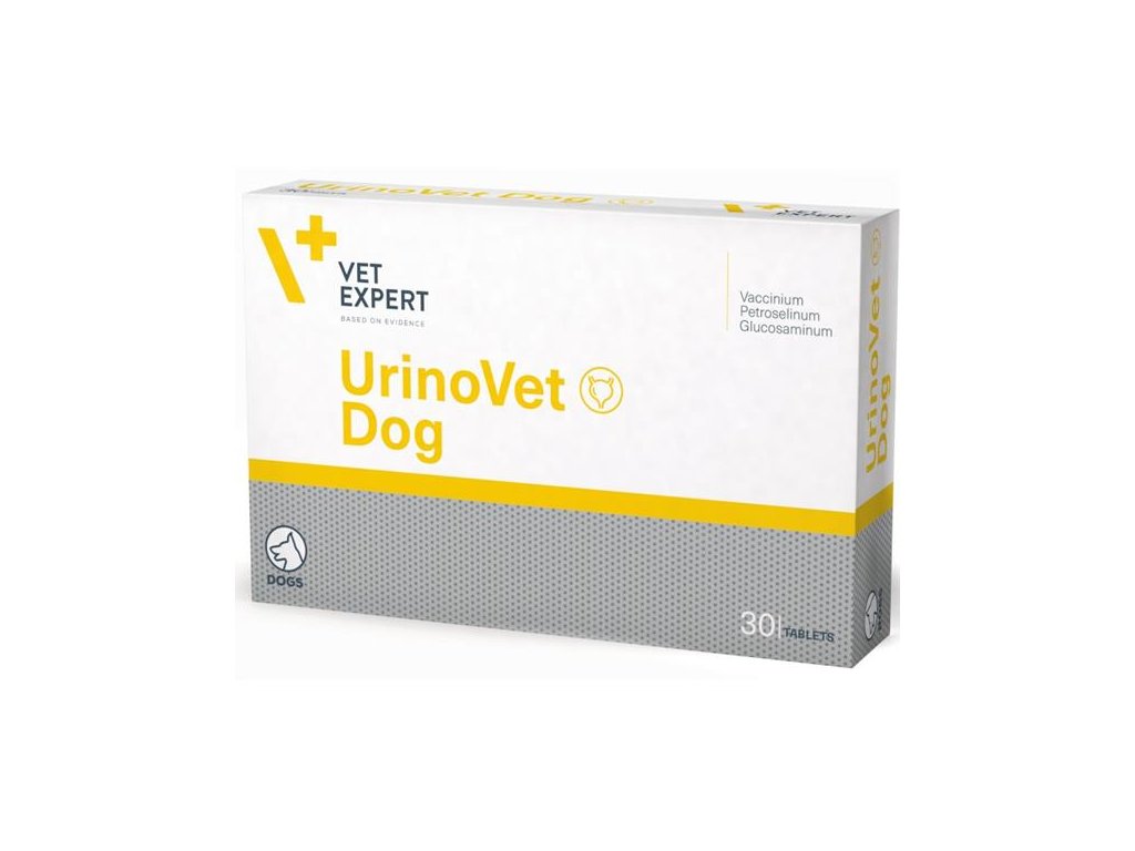 Doplněk stravy pro psy podporující správnou činnost jejich močového ústrojí. Obsažené látky snižují přilnavost bakterií k močovému měchýři a zvyšují objem vylučované moči. UrinoVet Dog se doporučuje podávat při krystalurii (tvorbě krystalů v moči) a urolitiáze (tvorbě kamenů v močových cestách) bez ohledu na typ útvarů (konkrementů), také po katetrizaci a odstranění konkrementů z močového měchýře. Hlavní účinné látky: extrakt z brusinek – zabraňuje ulpívání bakterií na stěnách močového měchýře, extrakt z petržele – působí močopudně a usnadňuje vylučování odpadních látek a mikroorganismů, glukosamin – jako přirozená stavební složka podporuje fungování přirozených ochranných bariér ve stěně močového měchýře. Hlavní přednosti: obsahuje složky s vědecky ověřenými účinky, má kombinovanou působnost. Složení: brusinka, petržel, glukosamin. Dávkování: 1 tableta na 10 kg tělesné hmotnosti denně.