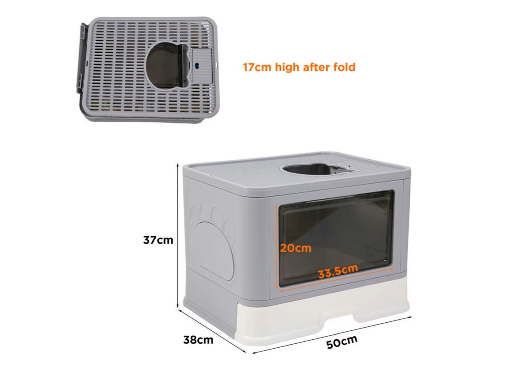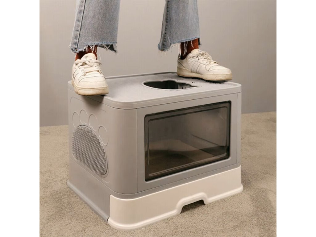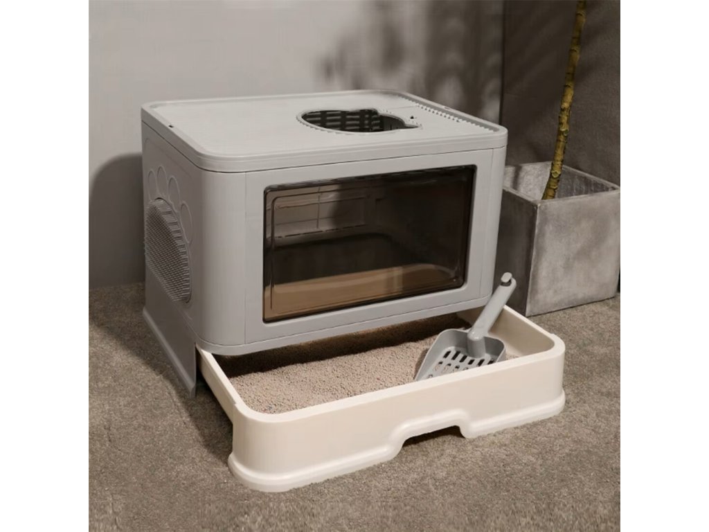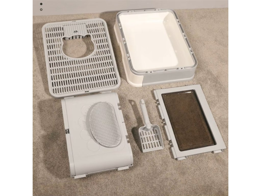 Moderní kočičí toaleta s lopatkou, masážním kartáčem a vyjímatelnou spodní zásuvkou pro snadné čištění steliva. Přední dvířka zajišťují volný vstup kočky, zatímco horní výlez s filtrem zachytává zbytky steliva na tlapkách a zabraňuje jejich roznášení po podlaze. Box je skládací a lehký, takže se snadno přenáší a je ideální i na cesty. Součástí toalety je i lopatka a masážní kartáč a ve vrchní části je prostor pro uložení sáčků na exkrementy. Rozměry toalety jsou 50x37x38 cm a přední vstup je v rozměrech 33,5x20 cm.