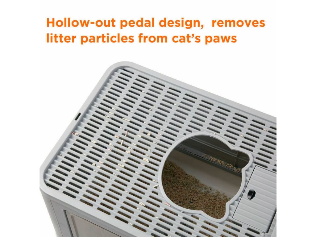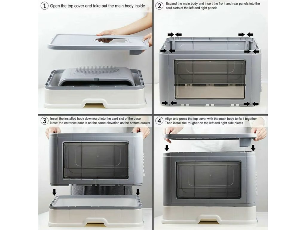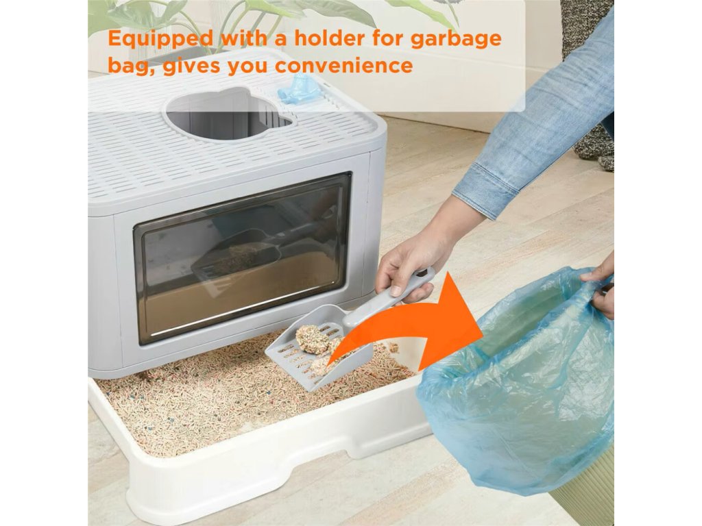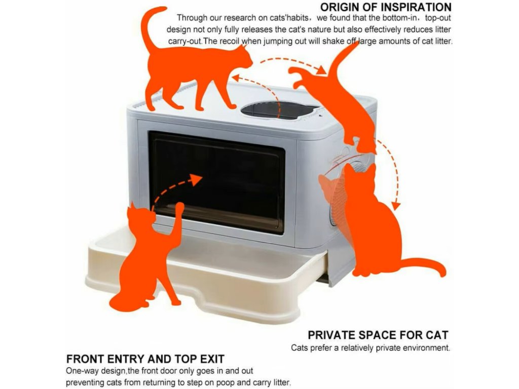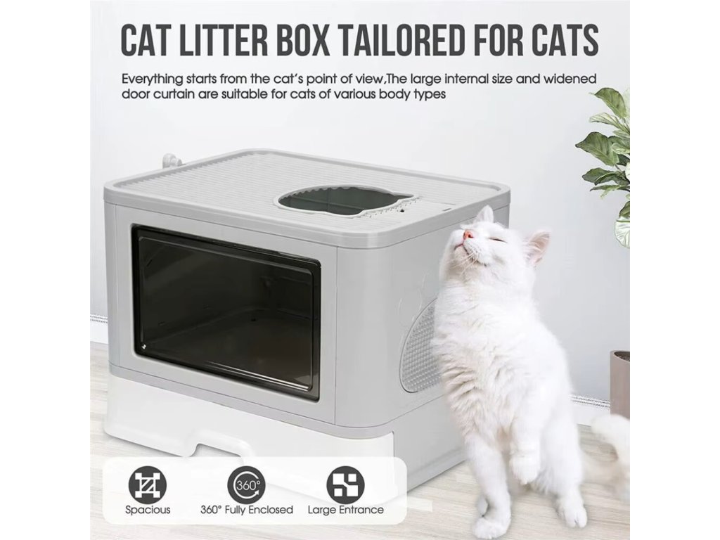 Moderní kočičí toaleta s lopatkou, masážním kartáčem a vyjímatelnou spodní zásuvkou pro snadné čištění steliva. Přední dvířka zajišťují volný vstup kočky, zatímco horní výlez s filtrem zachytává zbytky steliva na tlapkách a zabraňuje jejich roznášení po podlaze. Box je skládací a lehký, takže se snadno přenáší a je ideální i na cesty. Součástí toalety je i lopatka a masážní kartáč a ve vrchní části je prostor pro uložení sáčků na exkrementy. Rozměry toalety jsou 50x37x38 cm a přední vstup je v rozměrech 33,5x20 cm.